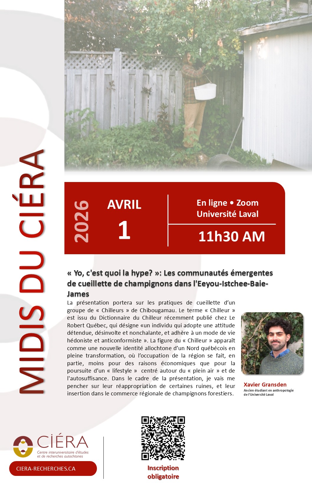 « La présentation portera sur les pratiques de cueillette d’un groupe de « Chilleurs » de Chibougamau. Le terme « Chilleur » est issu du Dictionnaire du Chilleur récemment publié chez Le Robert Québec, qui désigne «un individu qui adopte une attitude détendue, désinvolte et nonchalante, et adhère à un mode de vie hédoniste et anticonformiste ». La figure du « Chilleur » apparaît comme une nouvelle identité allochtone d’un Nord québécois en pleine transformation, où l’occupation de la région se fait, en partie, moins pour des raisons économiques que pour la poursuite d’un « lifestyle » centré autour du « plein air » et de l'autosuffisance. Dans le cadre de la présentation, je vais me pencher sur leur réappropriation de certaines ruines, et leur insertion dans le commerce régionale de champignons forestiers.»