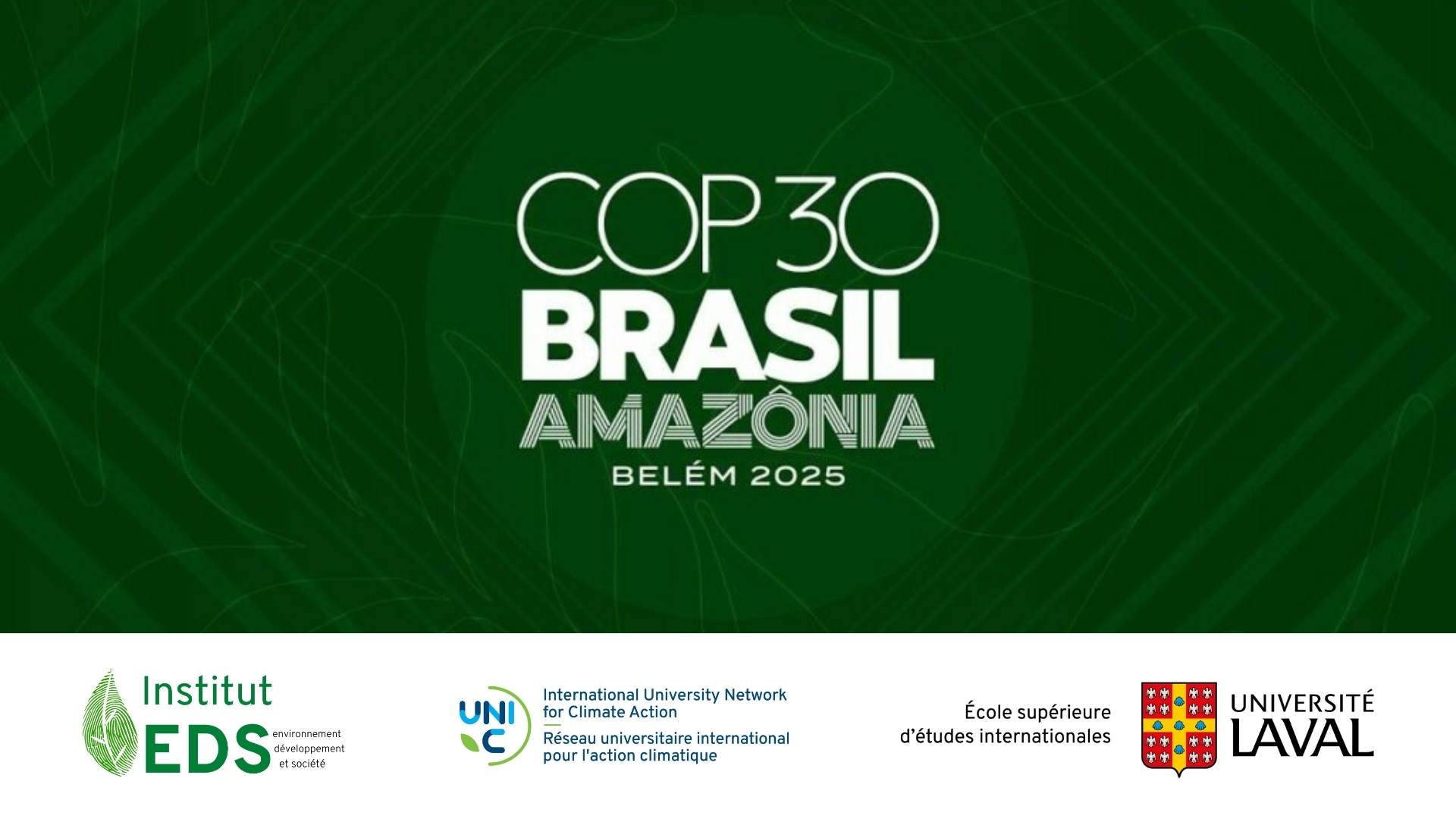 Dans le cadre de la COP 30 - 30e Conférence des parties à la Convention-cadre des Nations Unies sur les changements climatiques (CCNUCC) qui aura lieu du 10 au 21 novembre 2025, à Bélem, au Brésil. L'Institut en environnement, développement et société (Institut EDS), reconnu en tant qu’organisation observatrice de l’ONU pour l’Université Laval, est mandaté pour coordonner la délégation universitaire à la COP 30. Cette année, Allie Miot-Burneau, étudiant.e au doctorat en anthropologie et membre du CIÉRA sera parmi les sept délégué.es qui participeront sur place. L’organisation de la délégation est réalisée en collaboration avec l’École supérieure d’études internationales (ÉSEI), le Réseau universitaire international pour l’action climatique (Réseau UniC) et le Vice-rectorat aux affaires internationales et au développement durable (VRAIDD) de l'Université Laval.