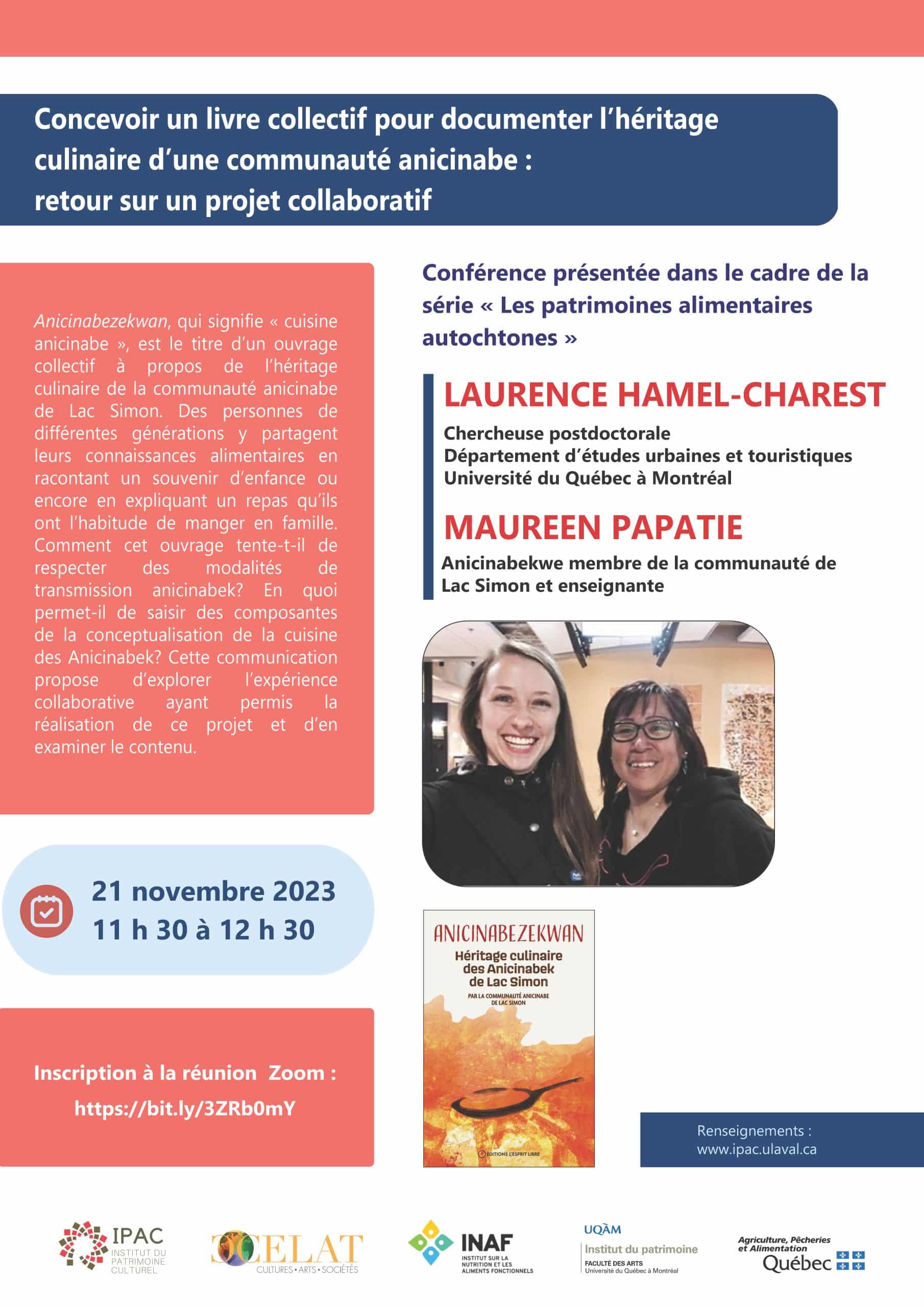 Anicinabezekwan, qui signifie “cuisine anicinabe”, est le titre d’un ouvrage collectif à propos de l’héritage culinaire de la communauté anicinabe de Lac Simon. Des personnes de différentes générations y partagent leurs connaissances alimentaires en racontant un souvenir d’enfance ou encore en expliquant un repas qu’ils ont l’habitude de manger en famille. Comment cet ouvrage tente-t-il de respecter des modalités de transmission anicinabek? En quoi permet-il de saisir des composantes de la conceptualisation de la cuisine des Anicinabek? Cette communication propose d’explorer l’expérience collaborative ayant permis la réalisation de ce projet et d’en examiner le contenu.