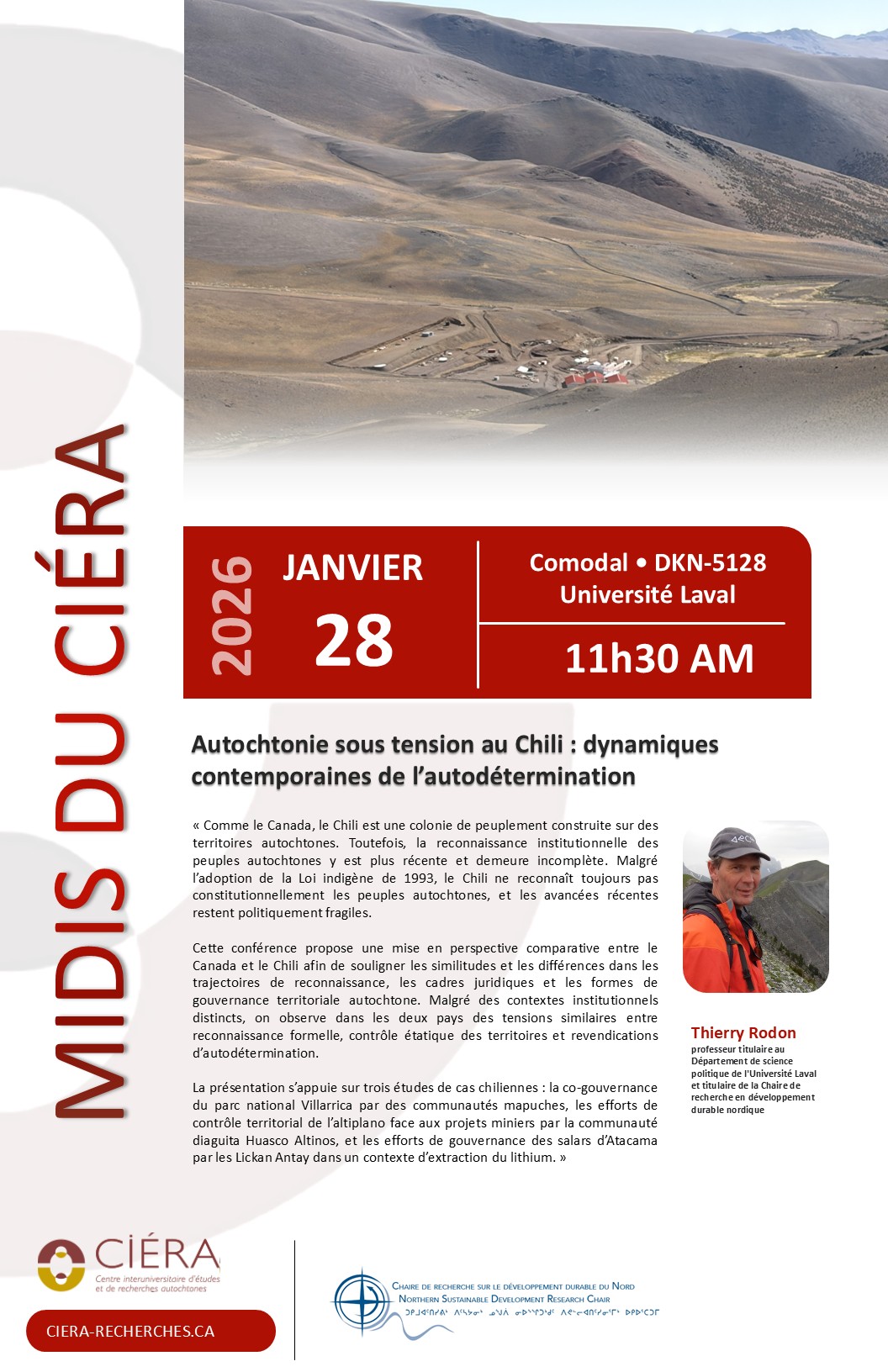 Cette conférence propose une mise en perspective comparative entre le Canada et le Chili afin de souligner les similitudes et les différences dans les trajectoires de reconnaissance, les cadres juridiques et les formes de gouvernance territoriale autochtone. Malgré des contextes institutionnels distincts, on observe dans les deux pays des tensions similaires entre reconnaissance formelle, contrôle étatique des territoires et revendications d’autodétermination.