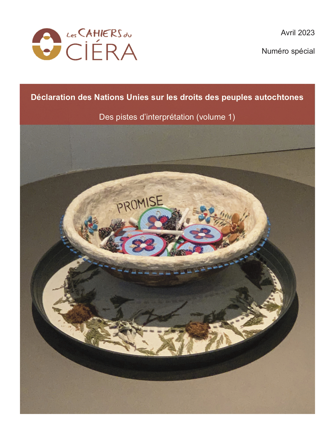 Motard, Geneviève, Doris Farget, Benoit Ethier, Marjolaine Étienne, Émilie Fortin-Lefebvre, Justine Gagnon, Karine Gentelet, Martin Hébert, Nicolas Houde, Laurent Jérôme, Gabriel Marcotte, Martin Papillon, Alexane Picard, Thierry Rodon et Jean-Philippe Uzel. 2023. « Déclaration des Nations Unies sur les droits des peuples autochtones : des pistes d’interprétation ». Cahiers du CIÉRA, « Déclaration des Nations Unies sur les droits des peuples autochtones : des pistes d’interprétation », Numéro spécial 1.